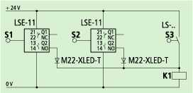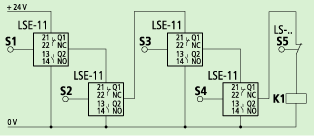 使用兩個普通的電子機械式限位開關或兩個電子限位開關(LSE-11; LSE-02)可以實現(xiàn)符合EN 954-1中第3和4類的限位監(jiān)控。